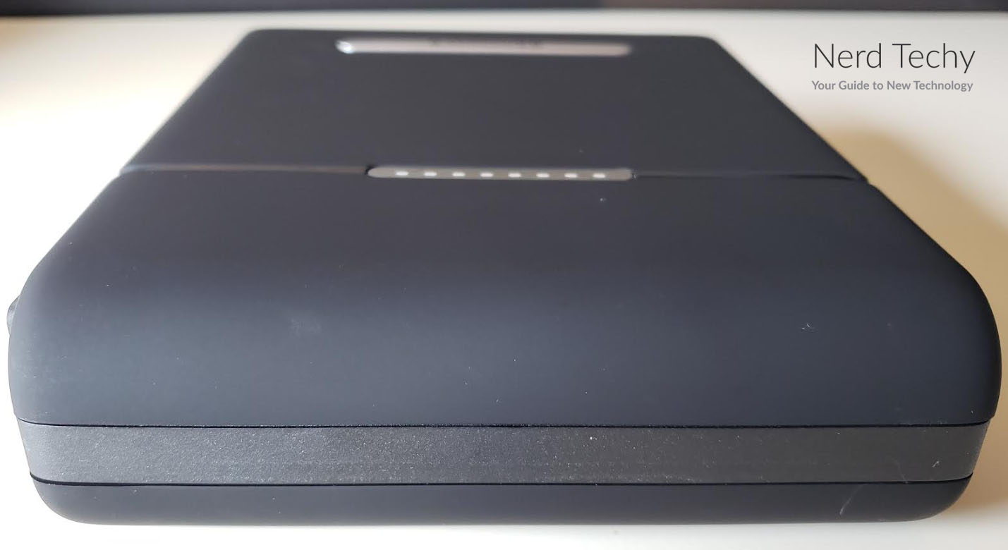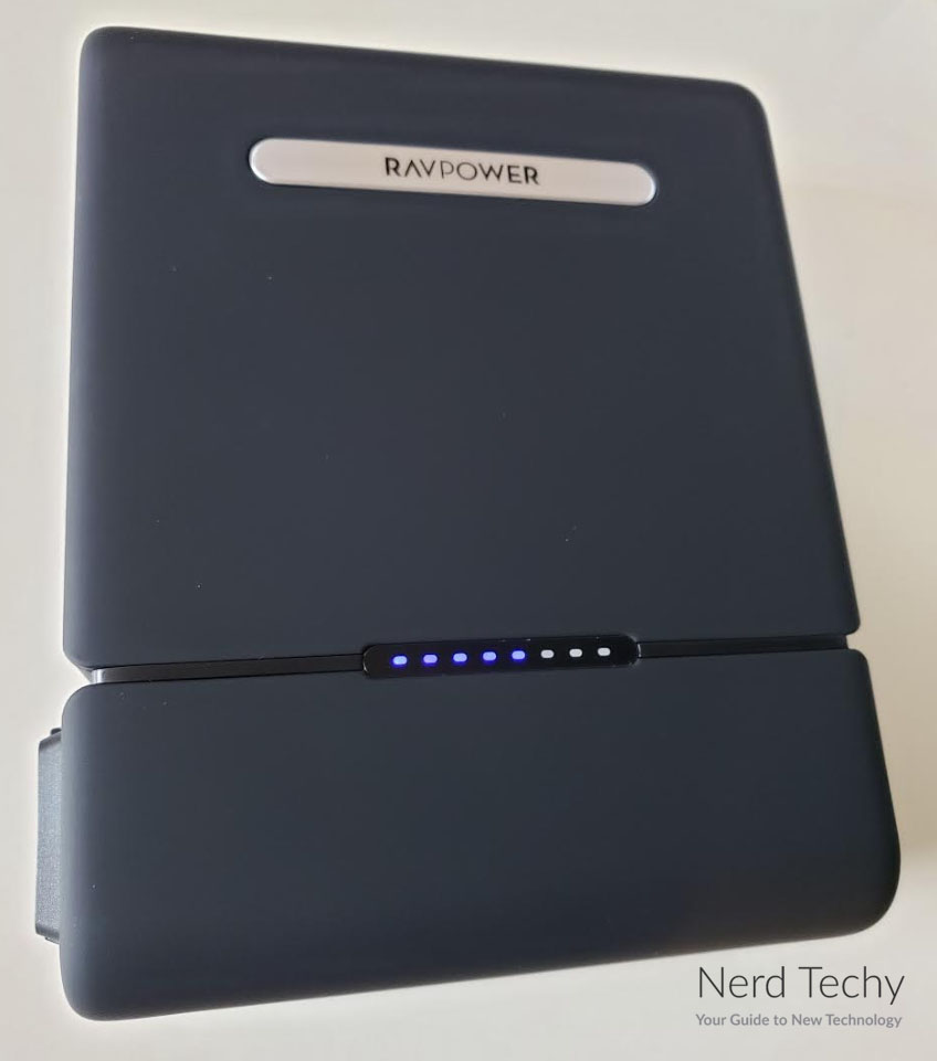 机箱本身是由光滑的黑色ABS塑料构成。它有一个弯曲的轮廓,没有任何尖锐的角落损坏你的其他齿轮。在顶部,有一个银色的牌匾,上面装饰着黑色的RAVPower标志。还有一排8个亮蓝色的led灯用来显示功率水平。这些led灯通常是关闭的,以节省电池寿命。但是,在使用电源时,它们会发光。led位于环绕整个外壳的凹槽中。该槽将设备的USB充电器部分与交流充电器部分分开。