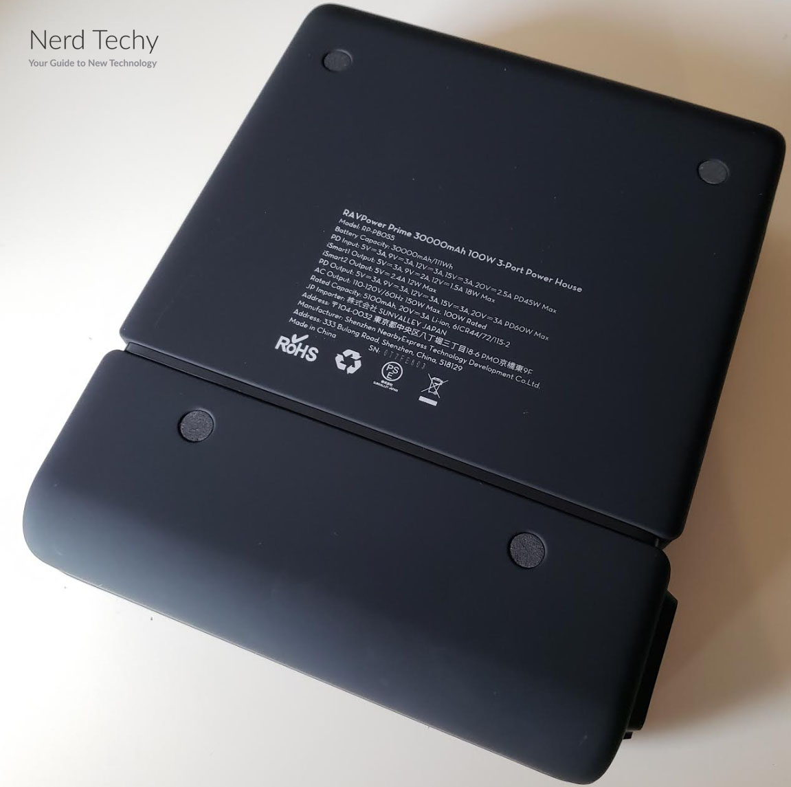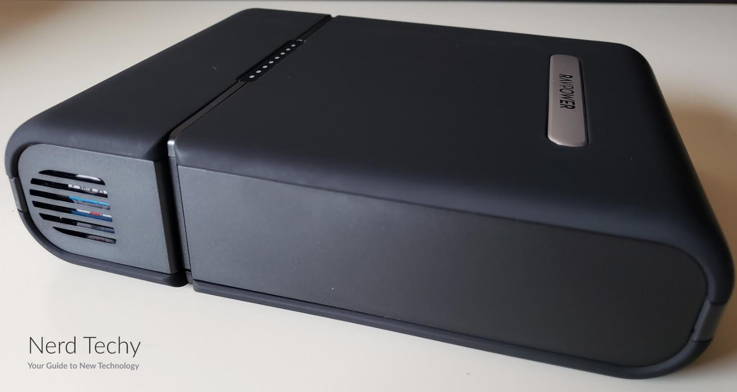 RAVPower 30000mAh便携式交流充电器的特点之一是使用非常安全。它有一个内置的风扇,在后面的右边的单位后的交流端口。这个风扇从左边的通风口吸入空气到右边的通风口。当电池温度达到华氏122度时,风扇就会自动启动。当温度回落时,风扇会自动关闭。这是一个非常好的安全功能,但它在运行时确实会发出呼呼的声音。