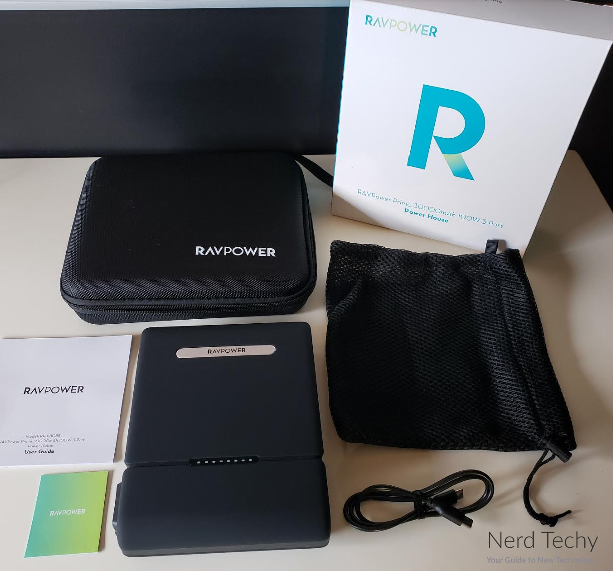 RAVPower 30000mAh便携式交流充电器还配有一些配件,使其功能更强。首先,这是一根24英寸的USB Type-C充电线。其次,有一个结实的旅行袋。它不是完全防压的,但它填充很好,拉链很容易打开和关闭。最后,你还可以得到RAVPower 18个月的制造商保修,以保护你不受任何缺陷的影响。