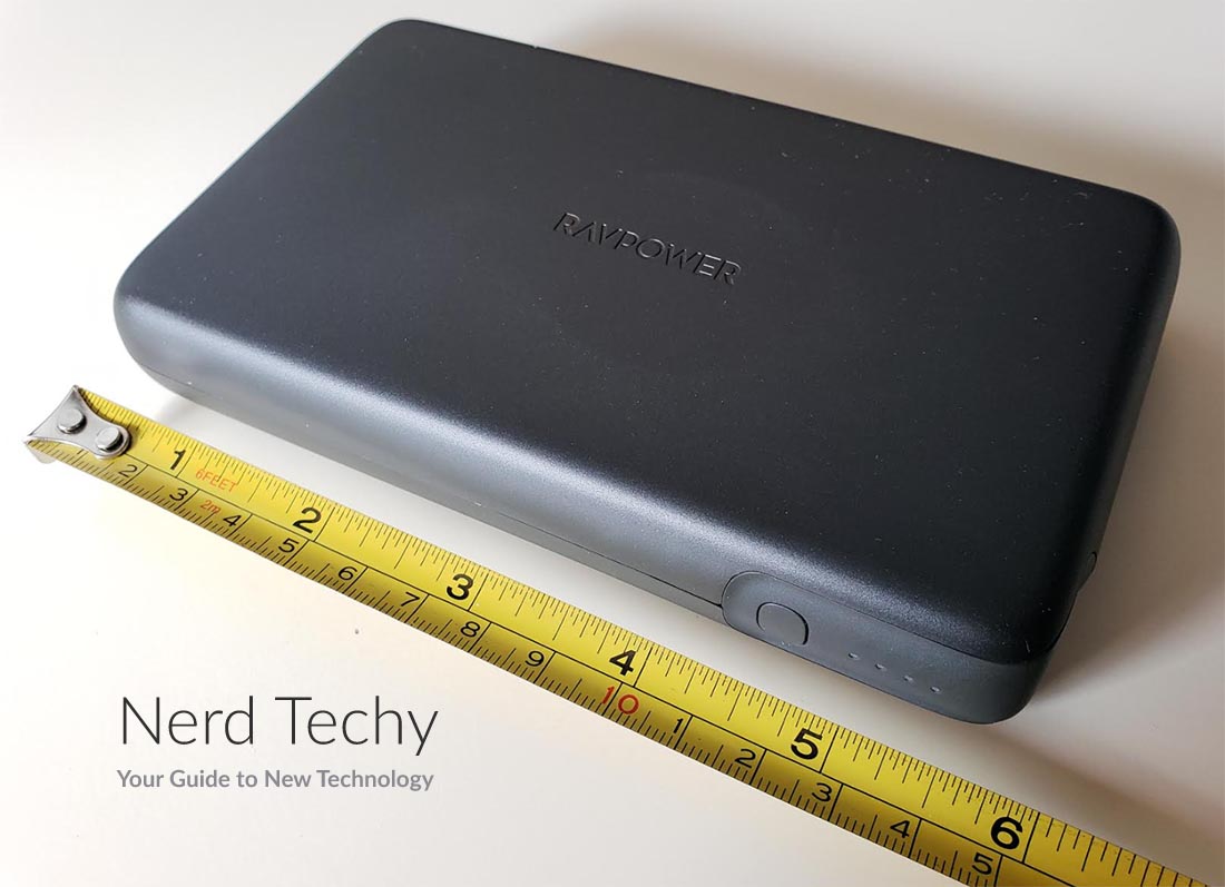 的RAVPower模型RP-PB232比一般的口袋大小的电源银行要结实一些。它长5.9英寸,宽3.4英寸,与一款更大的智能手机的外形相似。然而,它有整整一英寸厚,这有点大了。它重1.3磅,并不重得离谱,但确实有一定的重量。如果你把它放在口袋里,你就会感觉到它。你最好把它装在背包、笔记本电脑包或钱包里。