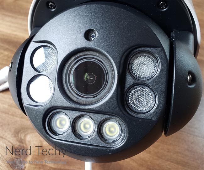下半部分为黑色。它包括主摄像机外壳,夹在从上外壳向下延伸的两个托架之间。支架略圆,具有吸引人的曲线轮廓,符合相机的整体美学。相机本身的主镜头在中心,上面有一个小的运动检测针孔。在相机下面,有一个明亮的聚光灯,呈现出一个宽阔的椭圆形。在镜头的侧面,还有四个红外聚光灯。