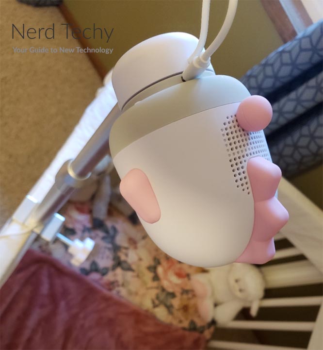 的Simshine Baby Pro Smart Baby Monitor有一个有趣、好玩的设计。外壳是一个半球形圆柱体,带有一个平底座,便于放置在梳妆台或床头柜上。大部分材料为哑光白色塑料,底部为浅灰色,正面有一个小徽标。然而,它是由一对看起来像鸡或企鹅翅膀的小橡胶瓣装饰的。顶部后面还有一个橡胶梳,进一步增强了鸡肉般的外观。您可以订购粉色或黄色高光,以适合您托儿所的装饰方案。