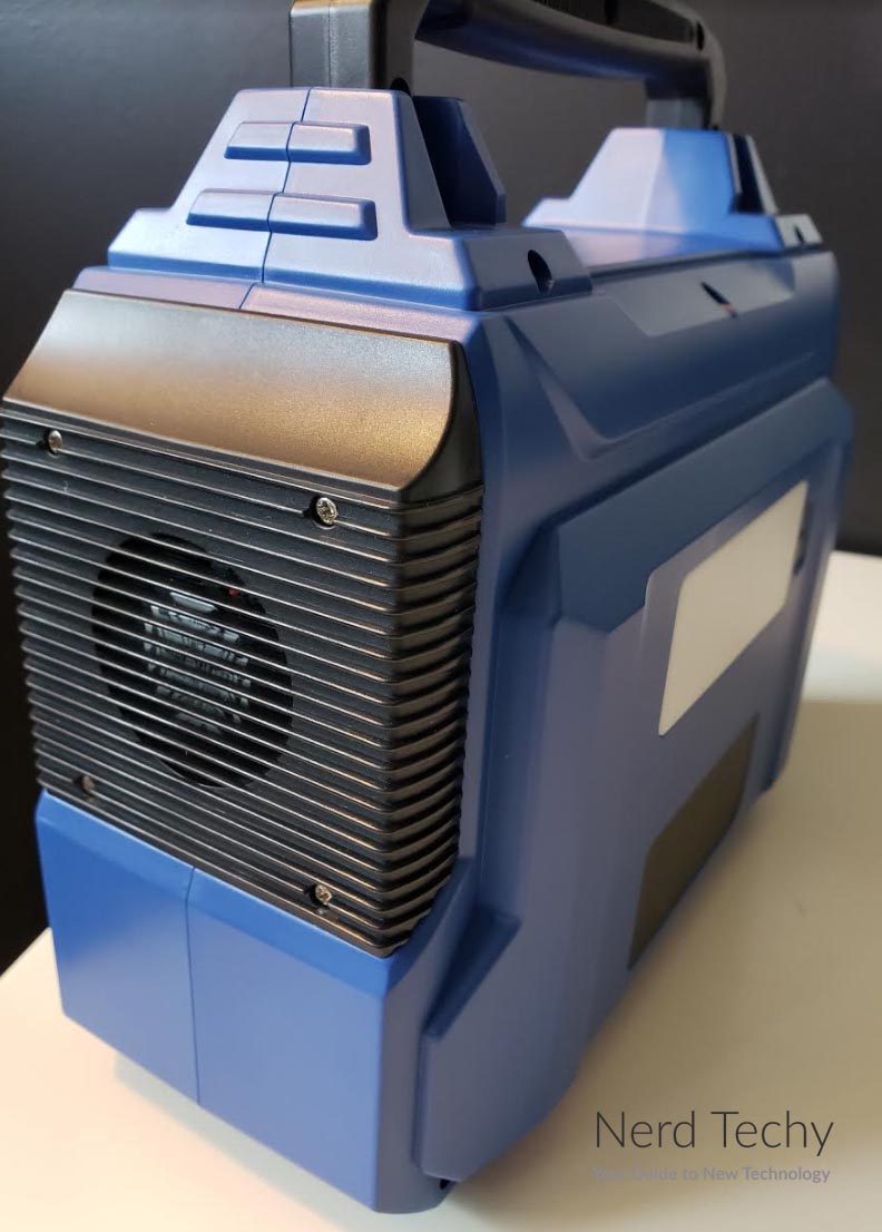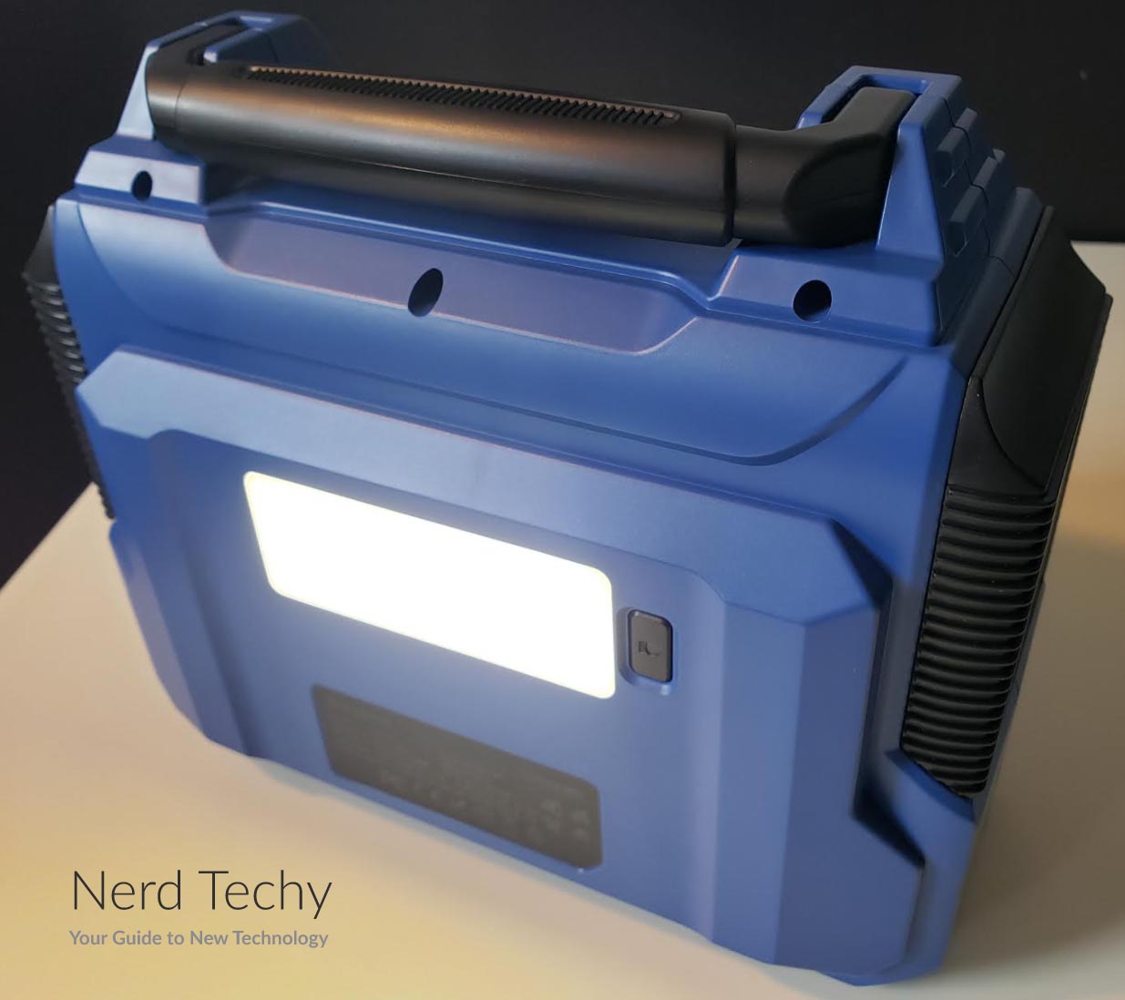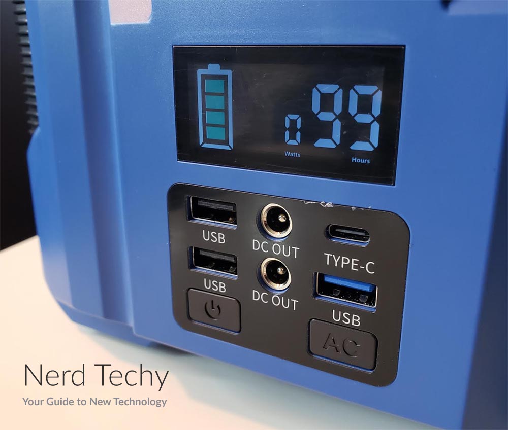 在前面的情况下,你会发现一个吸引人的LCD显示。这将向您展示您需要知道的所有内容。在左边,有一个电池电量读数,有一个简单的蓝色图标,有4条。在中间,有一个数字读数显示输出瓦特数。在右边,第二个数字读数显示输入功率,如果有的话。这部分显示器还可以显示估计剩余电量小时数。你可以轻按屏幕显示你的信息,充电时它会自动保持开着。当你不充电时,显示屏会在20秒后关闭。