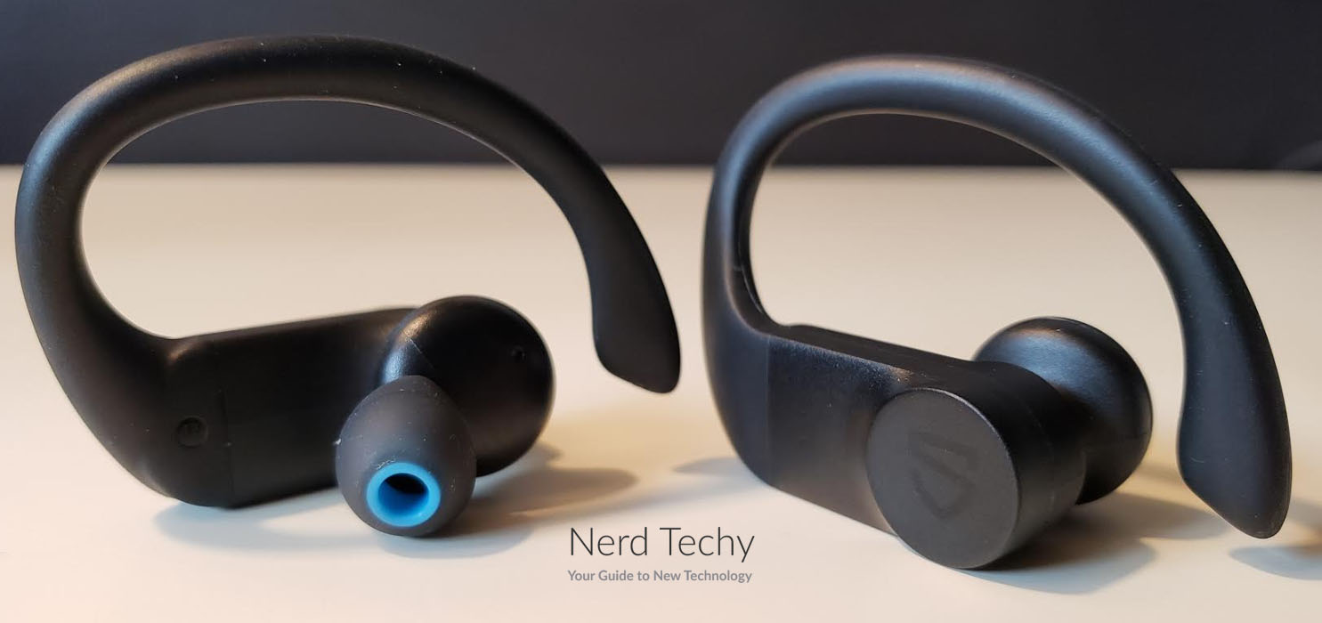每个耳塞的背面都有一个柔软的触摸控制按钮,上面有一个光滑的Soundpeats标识。这些按钮有多种功能,包括音量调节、轨道跳跃、接听和挂断电话。还有两个附加函数,我们将在后面更详细地讨论它们。建筑是坚固的,由聚碳酸酯,有一个谦逊的哑光完成。它的翅膀是用橡胶做的,可以弯曲以适应你耳朵独特的形状。TrueWings耳塞的防水等级为ipx7。这意味着它们能够承受3英尺深的水的完全淹没。显然,你不用担心出汗或下雨。但你也可以在淋浴时带上这些耳塞,这样你就可以在洗漱时继续卡壳。