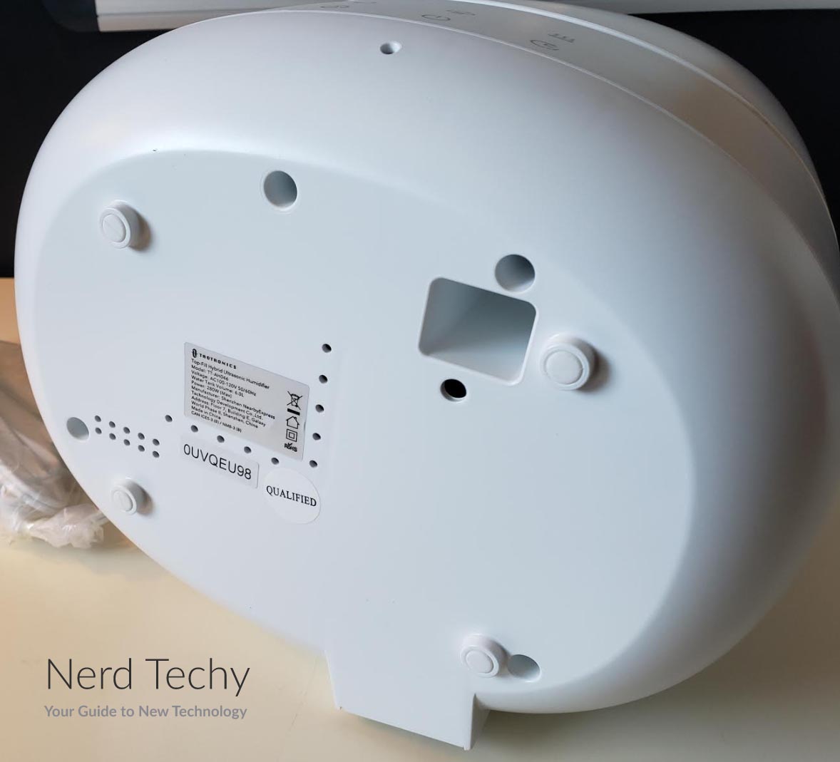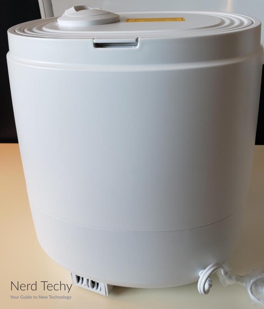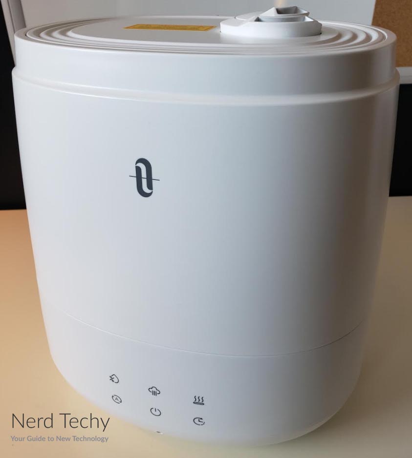 的涛创6L超声波加湿器具有椭圆形轮廓,略倾斜的设计。这使它具有友好的外观,并以其白色表面,它应该适合大多数décor方案。表面还很光滑,这意味着它会吸引一些指纹,但也很容易清洁。总的来说,它宽11.71英寸,深10.71英寸,高8.66英寸。它空着时重4.5磅,所以很容易移动。不仅如此,即使在满载的情况下,1.58加仑的油箱也只会增加大约12磅的重量。如果你需要在一个房间填满它,在另一个房间使用它,这不会是一个主要的障碍。