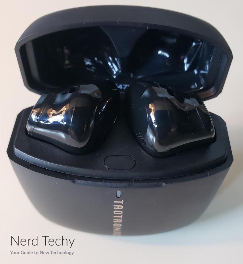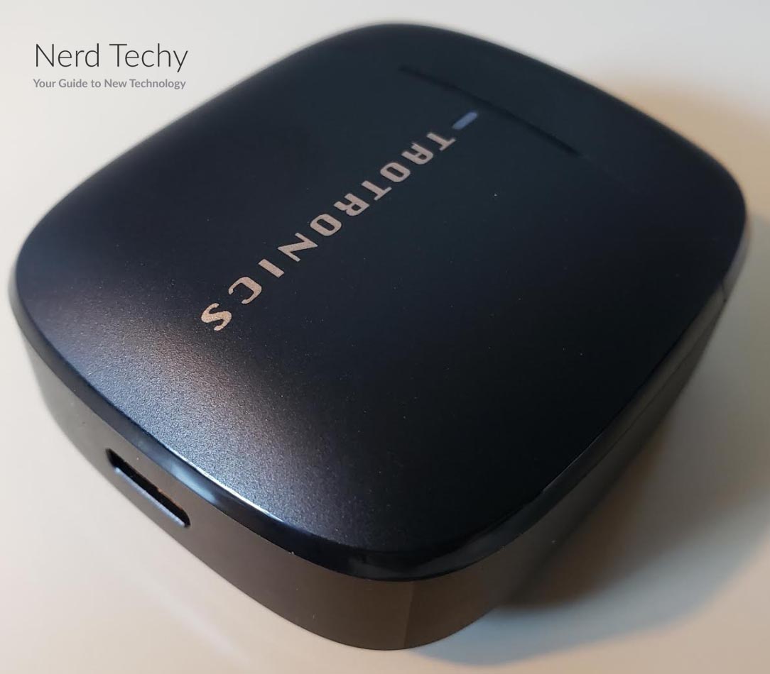 该外壳是由类似的黑色ABS塑料制成的耳塞。这创造了一个统一的,匹配的外观,将整个套件绑在一起。棱角是圆角的,棱角是斜角的,所以当你拿着它的时候,它不会刺到你。在盖子下面,有一个LED灯,当你的花蕾充电时,它会发光。另外还有一个淘特onics的白色标识,这是这款裸机外壳上唯一的装饰。该套件配有USB Type-C充电电缆。它连接到充电盒背面的一个端口,就在盖子的铰链下面。