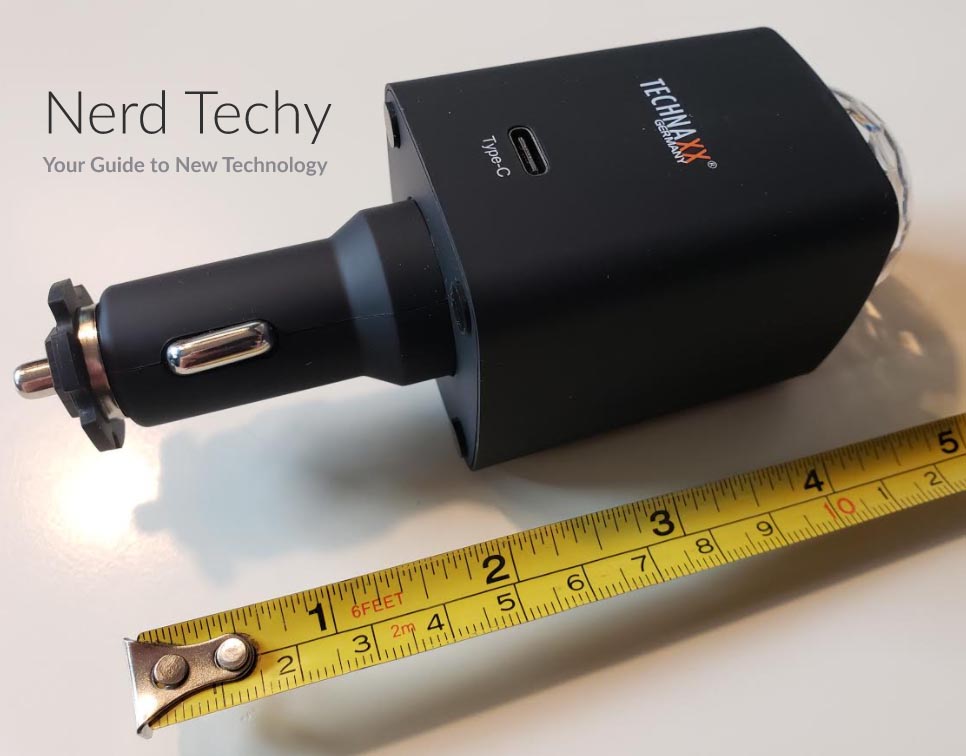 的Technaxx tx - 159是一个模块化的汽车充电器,也作为一个迪斯科派对灯。困惑吗?我们也是,。这是一个不寻常的噱头,但它的异想天开引起了我们的注意。充电器本身也可以分成几个部分。顶部,主要部分是一个矩形,面积为1.85英寸,高3.14英寸。高度包括顶部的半球形迪斯科灯。你还可以找到USB接口,为手机充电。烟头的主要部分附着在烟头上,烟头长5.39英寸。