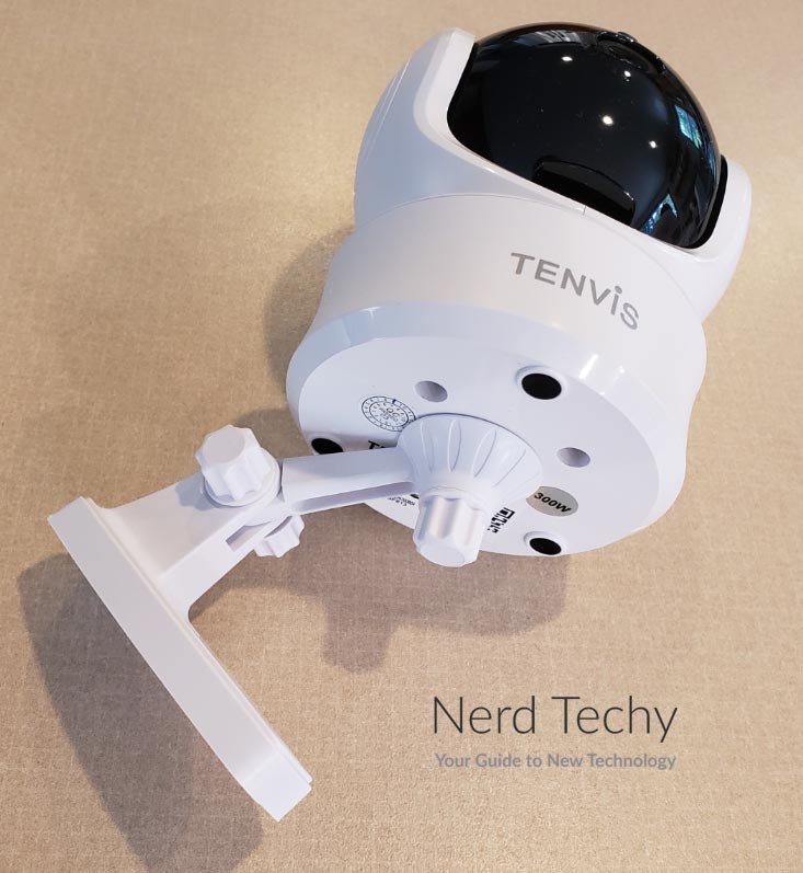 上面的房屋有一个很大的缺口在前面,揭示了镜头。镜头被安置在一个光滑的黑色内壳中,并在中心形成一个小的紫蓝色的圆圈。就在上面,你会看到一个更暗、更小的点。这是红外运动探测器,我们稍后会详细讨论。除此之外,整个房屋都是相当普通的,这正是我们所喜欢的。没有led或其他闪光部件来吸引不必要的注意。在底座的前面有一个石板灰色的Tenvis标识,但这是相当低调的。同样,右边的麦克风和扬声器孔也几乎看不见。