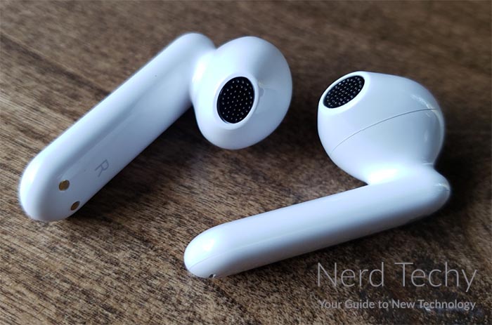 乍一看,时间水壶WT2边缘翻译耳机可能会被误认为是普通的耳机。它们由白色的塑料壳组成,它们放在你的耳朵里,还有垂直的耳钉。这些螺栓向下悬挂,包含麦克风和电池连接。它们还提供了一点重量,以保持耳塞垂直。表面处理有光泽,很容易保持清洁。你会看到麦克风底部的插槽,比普通耳塞的插槽更突出。
