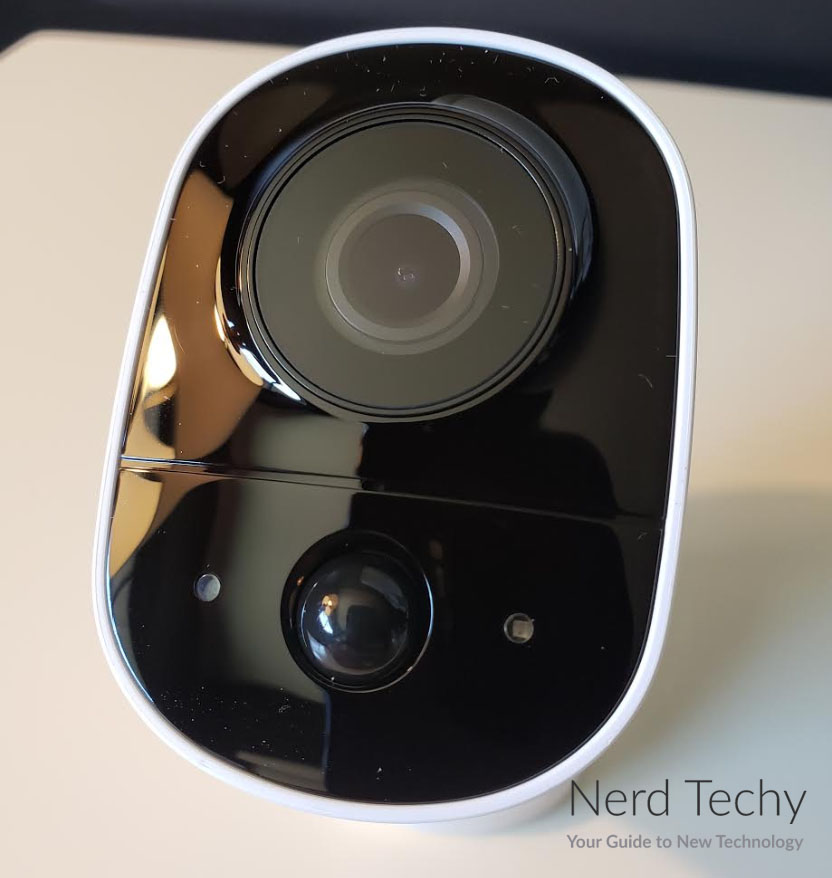相机的前部是黑色的,表面有光泽,不会积聚灰尘和污垢。镜头被安置在接近顶部,并由钢化玻璃罩保护。在镜头下面,你会看到一个红外运动探测器。在运动检测器的两侧,有两个红外发光二极管。肉眼看它们是黑色的,但实际上它们为夜视系统提供光线。你可以单独购买相机,也可以购买两套或四套相机以获得额外的保护。