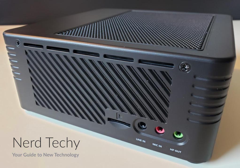 机器的前面只有顶部三分之二的通风。这是为了给右下角的红色电源按钮腾出空间。不仅如此,在左下角还有一个3.5毫米的辅助插孔。在辅助插孔旁边,还有一个小针孔,在必要时可以用来重置机器。这使得前面板和其他电脑面板一样功能齐全。