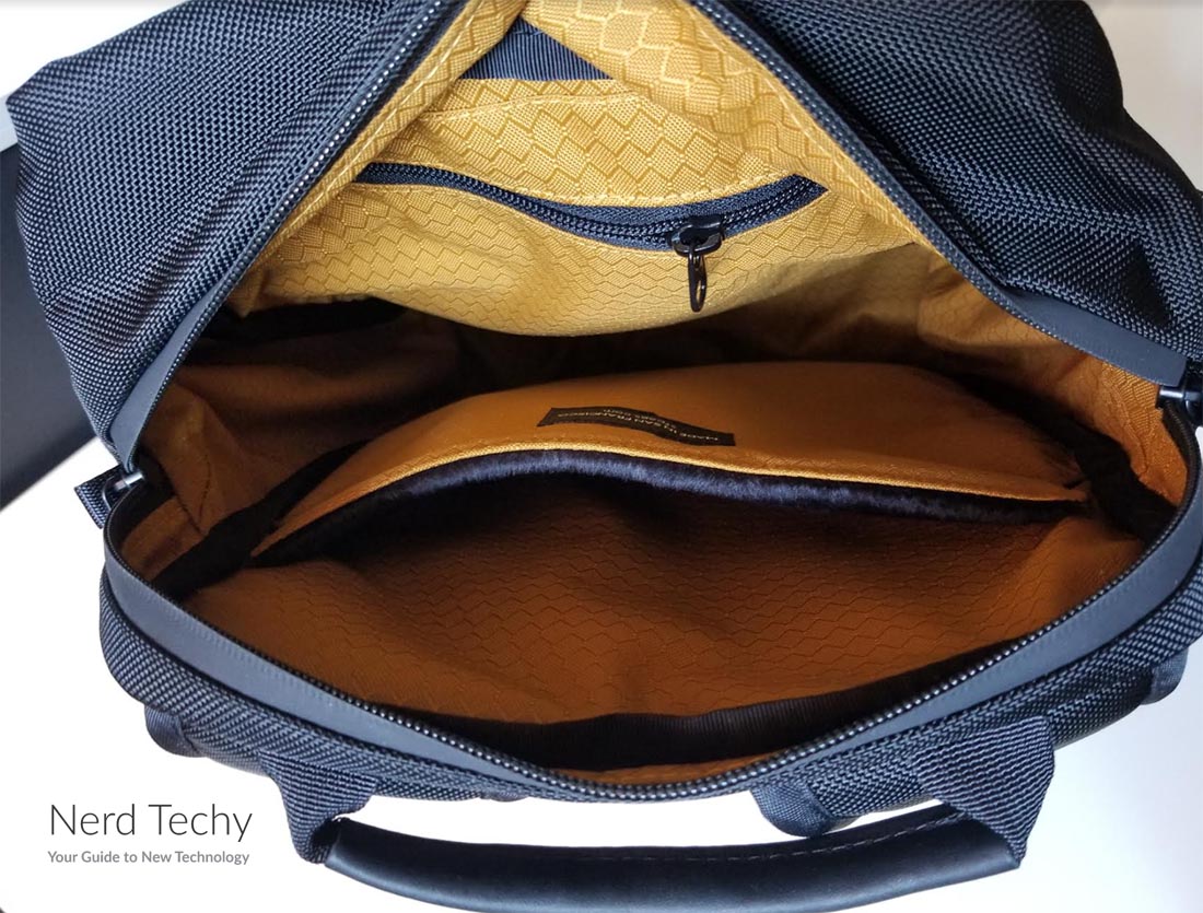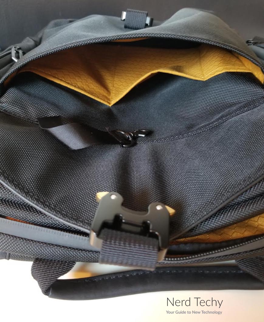 背包内部有一个舒适的金黄色尼龙衬里。这不仅仅是作秀。它是防水的,为你的装备提供了一层额外的保护。它也有一个光滑,柔软的表面,所以你不必担心你的齿轮被刮伤。除此之外,颜色鲜艳的衬里使它很容易发现袋子底部的小物体。