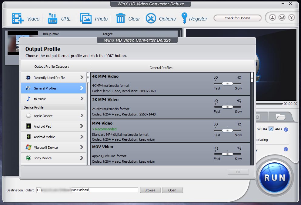 一旦文件被添加到您的队列,window will appear with a list of preset options. These options are sorted into 17 categories, with additional subcategories. Some categories are based on file format, while others are based on popular sites. For instance, there’s a category specifically for YouTube formats. We’ll talk more about your options in a minute. However, once an option has been selected, it will show in its own new category: Recently Used Profiles. So if you’re always uploading your videos to YouTube in 1080p, that option will be easy to find. Once you’ve chosen a format, just click the giant Run button in the bottom right to get started.