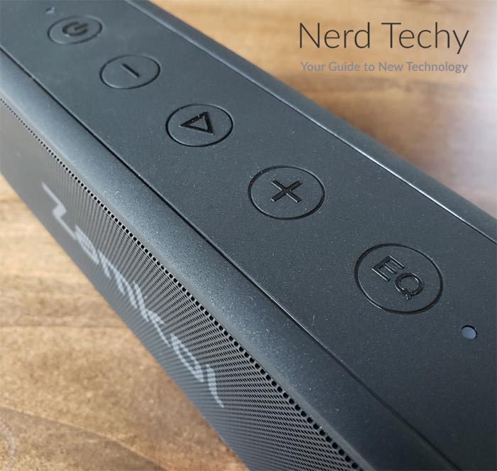 在顶部,你会发现一排物理控制按钮,用来操作扬声器。这些图标大而粗体,具有易于识别的高可视性图标。这里没有什么特别复杂的。左边有一个电源按钮,右边有音乐控制。这些由音量上下键组成,播放/暂停键直接位于中心。在最右边,你会发现EQ按钮,可以用来调整扬声器的声音轮廓。当我们讨论音频质量时,我们将进一步讨论这个功能。
