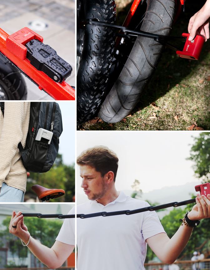 但真正的保护来自多功能性。这种紧凑且可折叠的设计让你可以像使用链条一样安全地保管东西,除了可以灵活地折叠和收起来。链状设计的总长度长达38.6英寸。所以你可以把两到三个大的自行车轮胎锁在一个环里。ZiiLock可以展开,甚至适合周围的树木或大的杆子。所以你很容易就能找到大的物体来固定你的自行车。