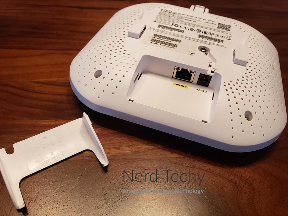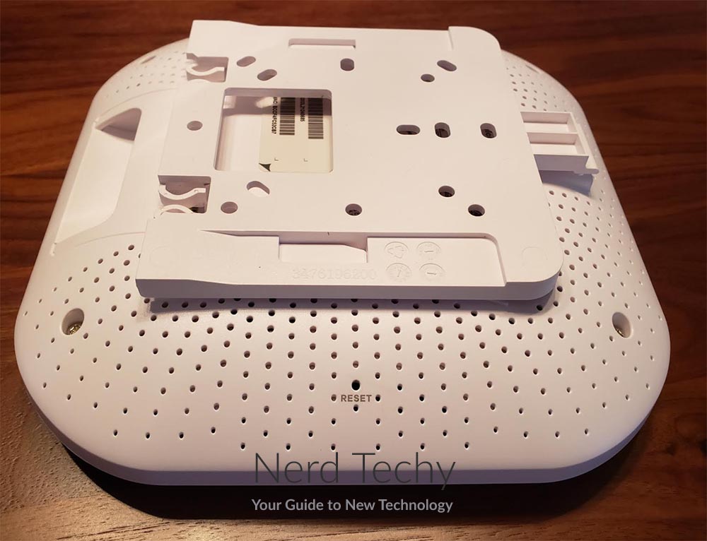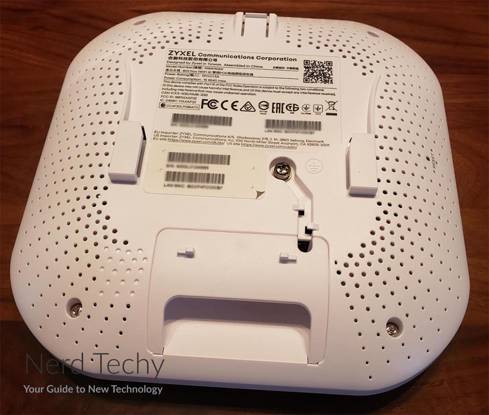 NWA110AX的底部有一组内置的导轨,它锁定在安装支架上。这个支架的优点是它既可以安装在墙上,也可以安装在天花板上。只要确保使用石膏板锚,如果你不希望它随着时间的推移变得松散。在后面,您将看到一个以太网端口,以及一个用于桶式直流电源的圆形端口。一个电源包括在套件中,所以你有一切你需要开始。